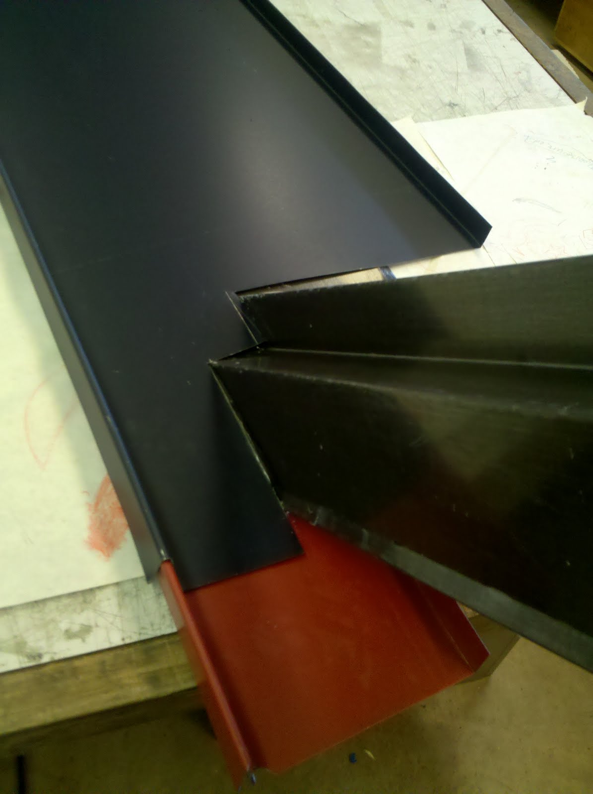 The pictures above display a sample mock-up of how one sheet will layer on top of the other in order to allow for proper drainage. We thank Brian for coming in to clarify with us this crucial detail as well as addressing other issues relating to detailing the roof. Communication throughout the whole design process with contractors and sub contractors is crucial in making sure that both parties are on the same table when it comes to detailing. Brian's mock-up also clarifies the sequencing of placing the roofing material as some of it acts as flashing for other parts of the dormer.