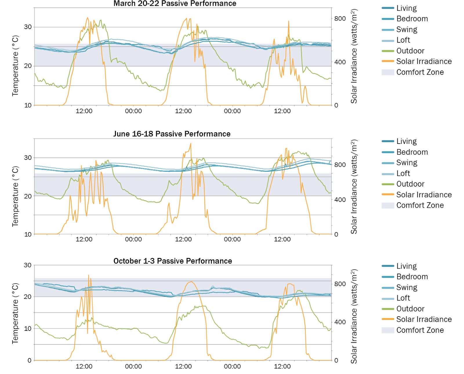 Earlier forms of this same test have shown interesting returns, generally showing the envelope is able to maintain a steady temperature range. Observations from June remained outside of the comfort zone entirely, however, though night temperatures clearly dropped into the comfort range. Effort by the resident to purge warm interior air in the evenings could have altered this, though high humidities in the Southeast-US often negates such efforts.
